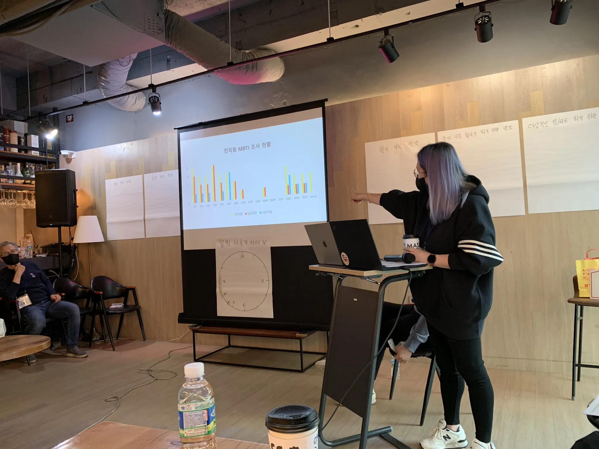 코로나 이후 오랜만에 갖게 된 워크샵 자리인 만큼, 그동안 해보지 못했던 회사에 대한 이야기에 대해 해보는 시간이 오전 일정으로 준비되어 있었는데요. 어떻게 하면 더 좋은 회사를 만들 수 있고, 어떻게 하면 모두가 더 효율적으로 일하고 더 나은 조직을 향해 나아갈 수 있는지에 대한 것을 주제로 모두가 자유롭게 토론을 하는 시간을 가졌습니다. 사전에 TF팀에서 조사한 설문조사 결과를 경영지원팀 팀장님이 공유해주시는 것으로 시작하여 직원 모두가 회사가 더 나은 방향으로 나아가기 위해 우리가 고민해야 할 것, 그리고 회사에서 지원해줬으면 하는 건의사항에 대해 이야기 해보는 시간이 이어졌는데요.
