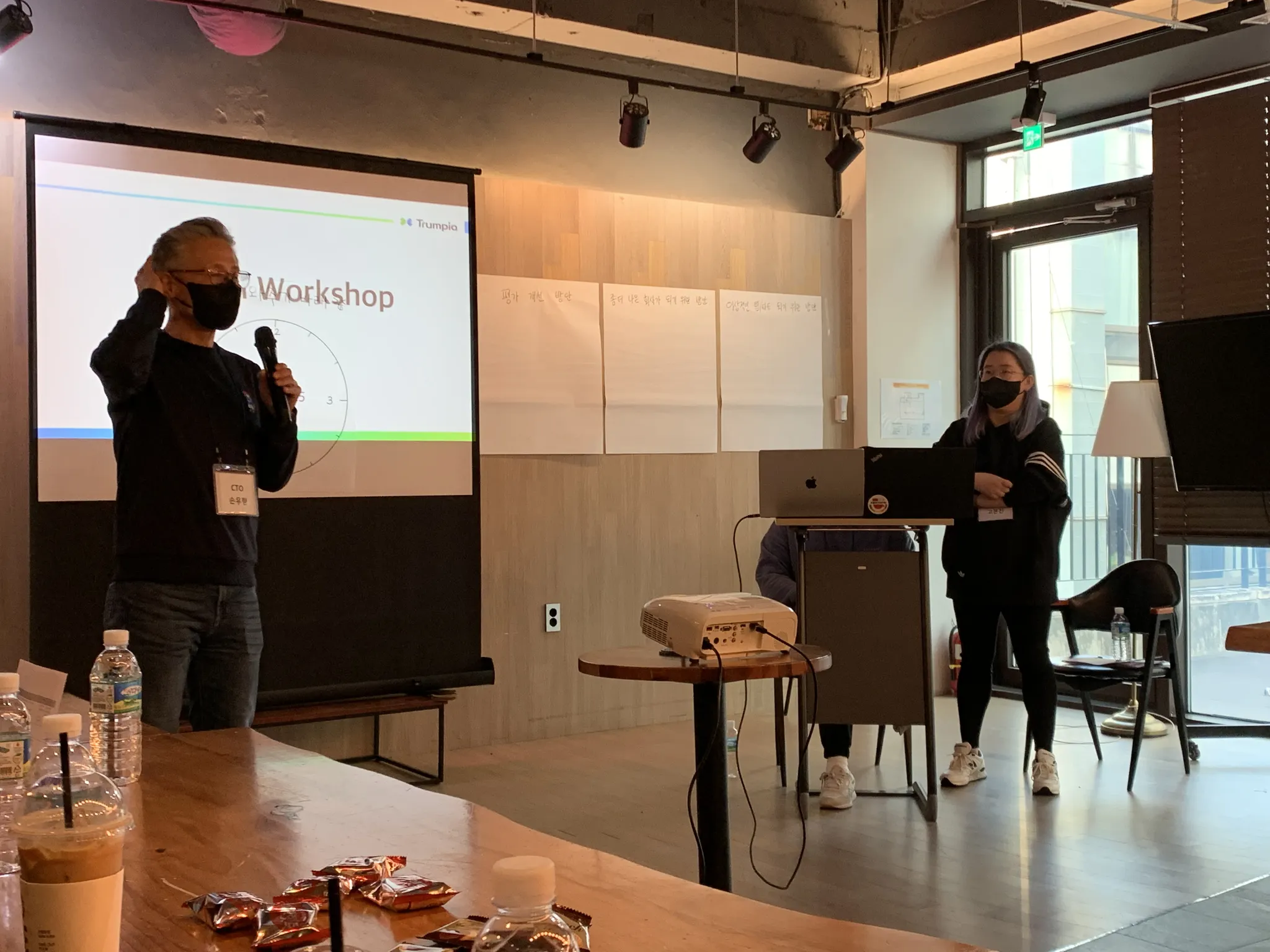 워크샵 당일 오전 스케쥴은 역삼역 인근의 아그레라운지에서 진행되었습니다. 오늘만큼은 회사가 아닌 워크샵 장소로 출근한 트럼피아 직원들을 처음 기다리고 있었던 건 TF 팀에서 준비한 깜짝 이벤트 ‘일찍 와주길 바래~’ 본인 이름이 쓰인 명찰과 주문한 음료를 받고 모두가 자리에 앉고 나서야 워크샵의 오전 일정이 시작되었습니다.